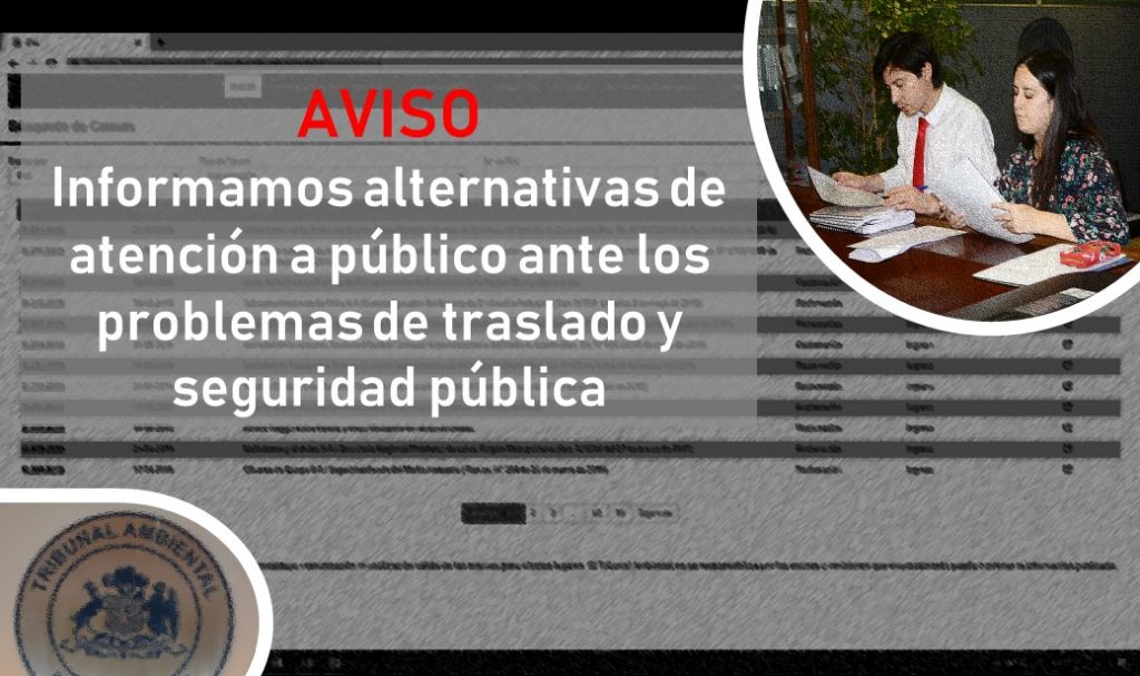 Ante las dificultades de traslado en la Región Metropolitana y las condiciones de seguridad para las personas, el Tribunal Ambiental de Santiago le informa que  cualquier escrito de plazo o diligencia urgente puede ser ingresada al Tribunal a través del sistema informático (Acceso Abogado) o por medio del buzón habilitado expresamente para el Tribunal Ambiental de Santiago en el zócalo del Palacio de Tribunales (Morandé 345, Santiago). Allí podrá depositar sus escritos registrando la fecha y hora de ingreso del documento mediante el sistema habilitado para ello.