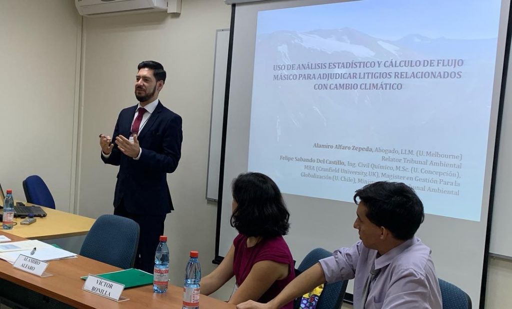 El trabajo presentado por el abogado del Tribunal, que fue desarrollado en conjunto con el ministro Felipe Sabando, abordó el «Uso de análisis estadístico y cálculo de flujo másico para adjudicar litigios relacionados con cambio climático”.
